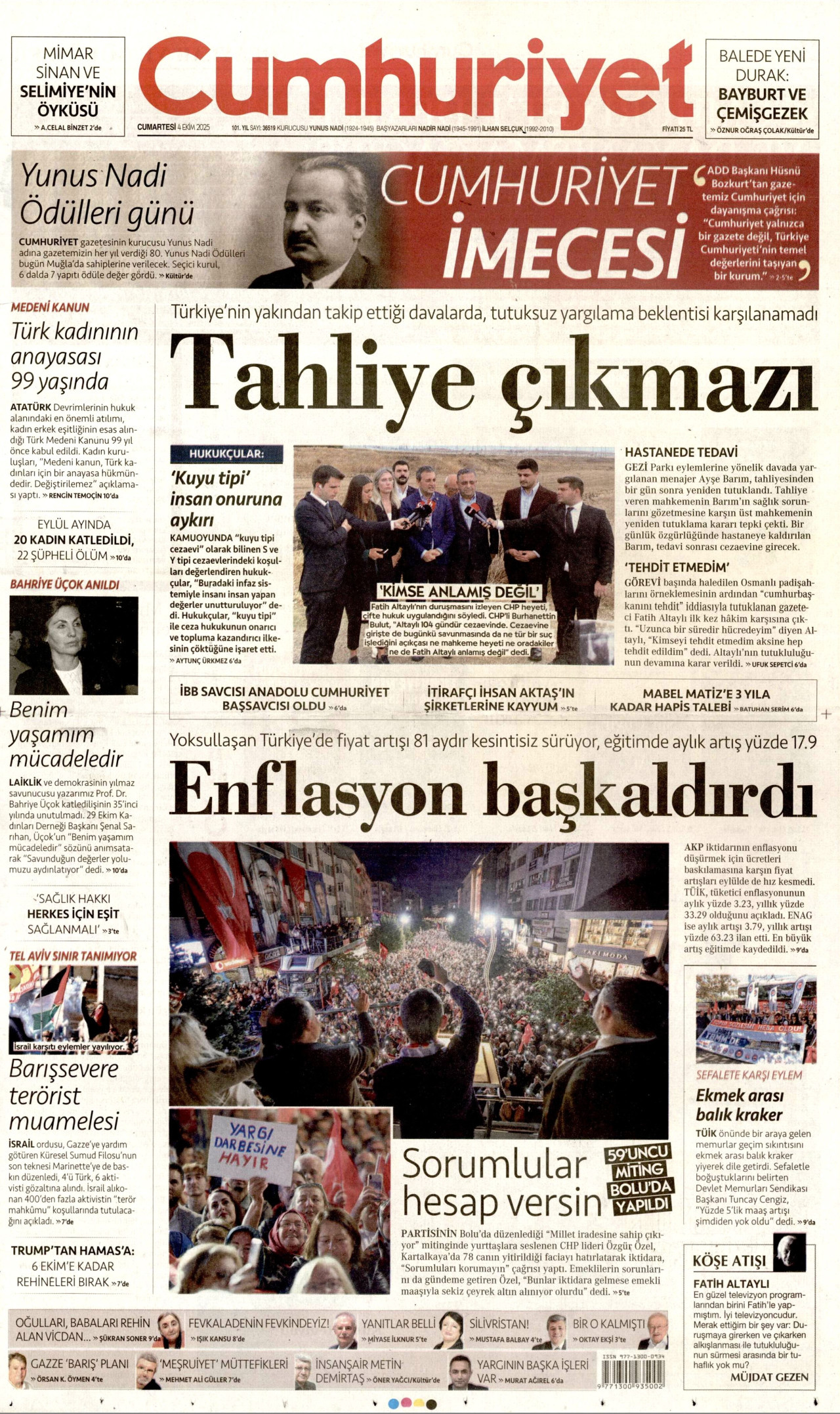 CUMHURİYET Gazetesi 04 Ekim 2025, Cumartesi Günü Manşeti