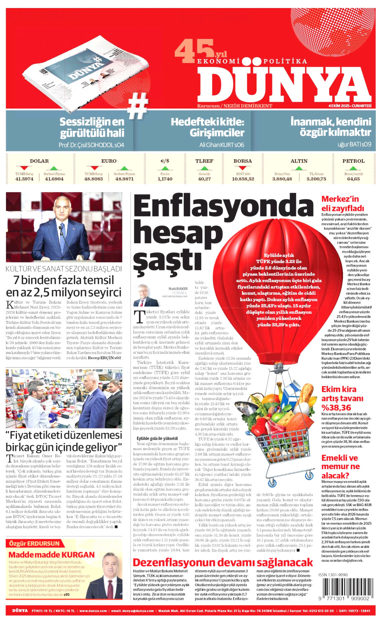 DÜNYA Gazetesi 04 Ekim 2025, Cumartesi Günü Manşeti