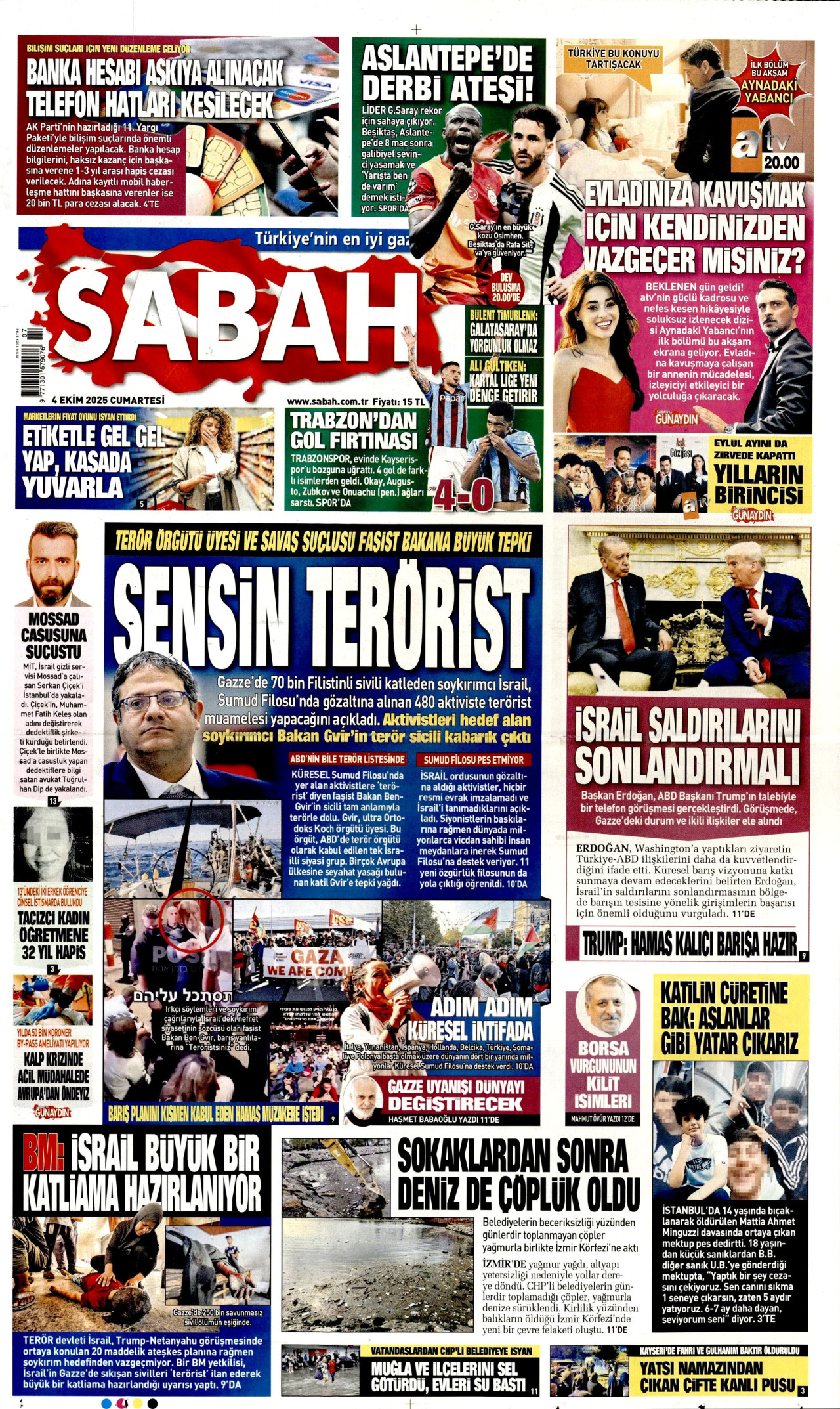 SABAH Gazetesi 04 Ekim 2025, Cumartesi Günü Manşeti